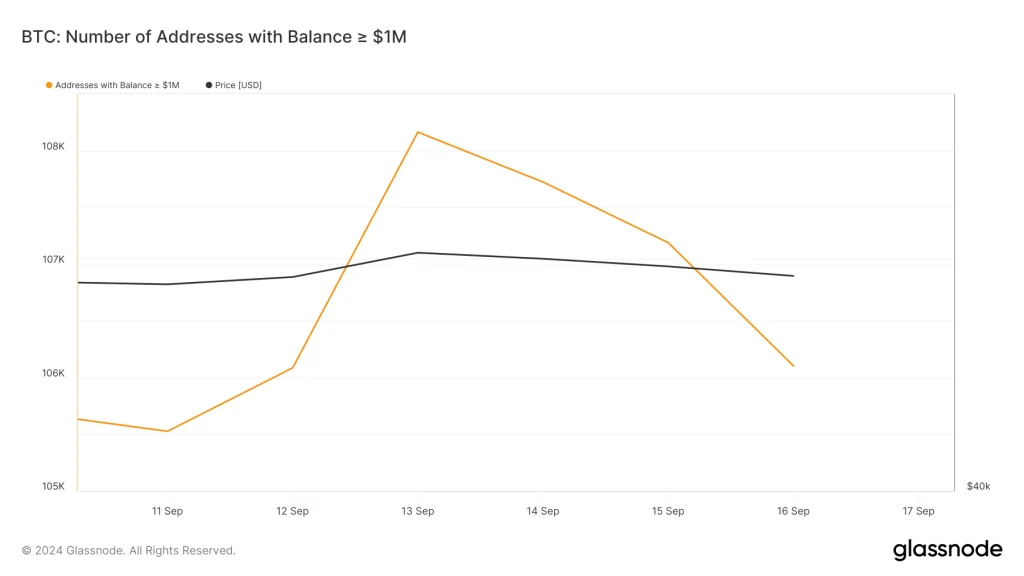 Data from Glassnode shows that Bitcoin whales are selling off ahead of the highly anticipated FOMC meeting. For instance, on September 13, the number of addresses holding over $1 million worth of BTC was 108,163.